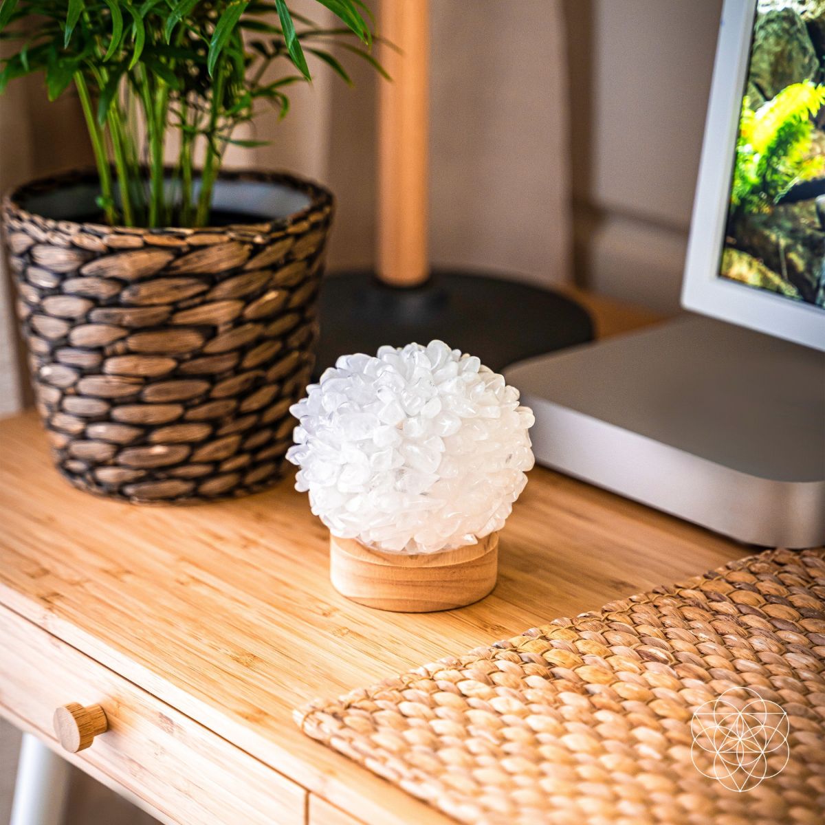 Clear Quartz is also recognized for its potential to enhance mental clarity. Place the lamp on your work desk to help boost concentration and productivity, especially during evening work sessions. Additionally, it may provide some protection against electromagnetic field (EMF) radiation emitted by electronic devices. Clear Quartz is thought to absorb negative influences and create a more harmonious environment.